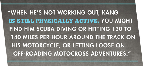 When he’s not working out, Kang is still physically active. You scuba diving or hitting 130 to 140 miles per hour around the track on his motorcycle, or letting loose on off -roading motocross adventures.